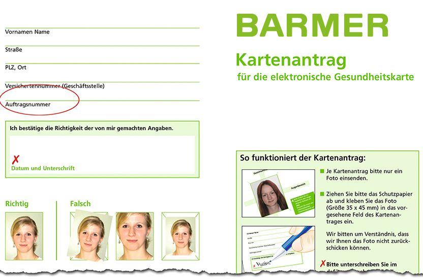Die Auftragsnummer finden Sie auf dem Kartenantrag für die elektronische Gesundheitskarte oben links unterhalb der persönlichen Daten.